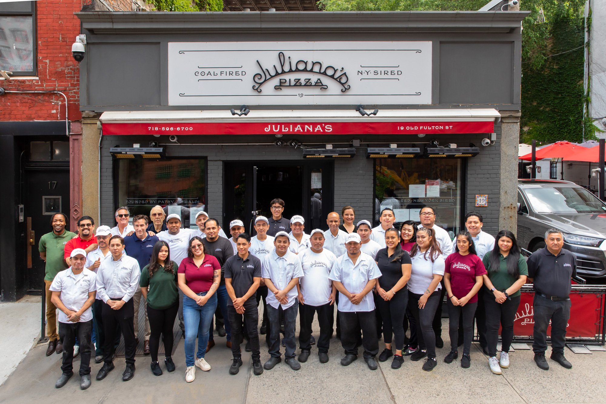 Juliana’s heralds the return of Patsy Grimaldi, NYC’s most celebrated pizza proprietor, to 19 Old Fulton Street, the original location under the Brooklyn Bridge where he and his late wife, Carol, founded legendary Grimaldi’s Pizzeria. Unbeknownst to many, Pat and Carol sold Grimaldi’s and retired almost two decades ago. In 2012, they “unretired” to partner with their close friend to establish Juliana’s, proudly preparing and serving pies the way Patsy has for generations: deliciously thin crusts hosting only the finest housemade, locally and internationally-sourced toppings, expertly turned inside the original hand-built coal-fired oven—the first commissioned in New York in over fifty years.